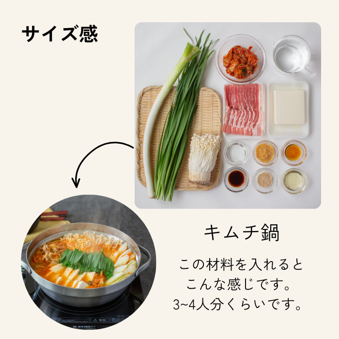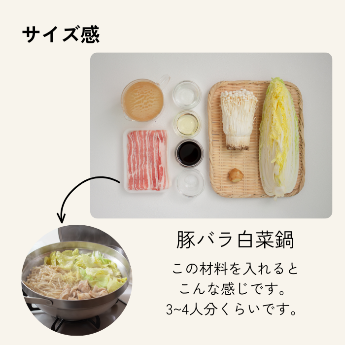 市販のお鍋の素(3~4人)の材料がちょうどよく入るくらいのサイズ感です。