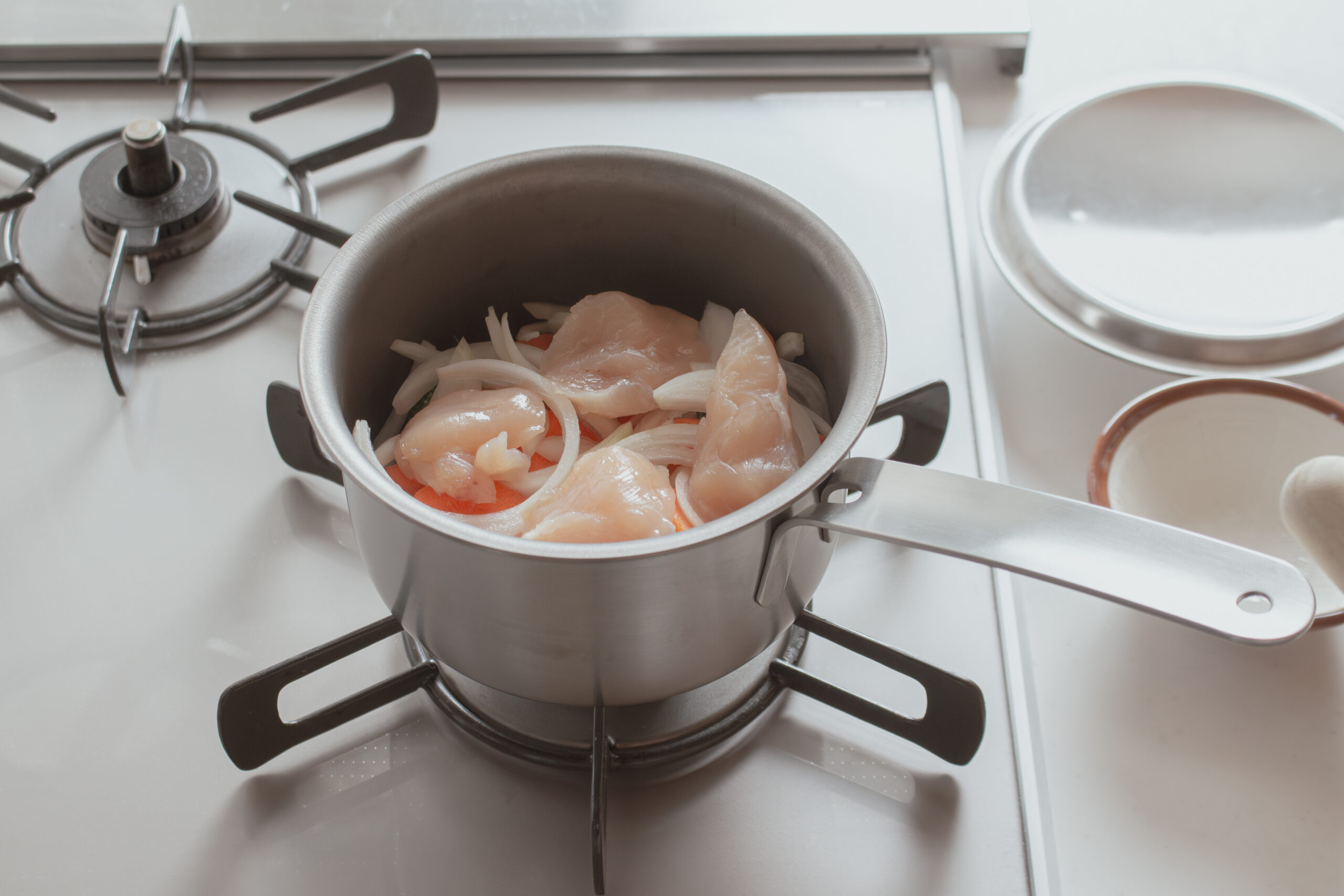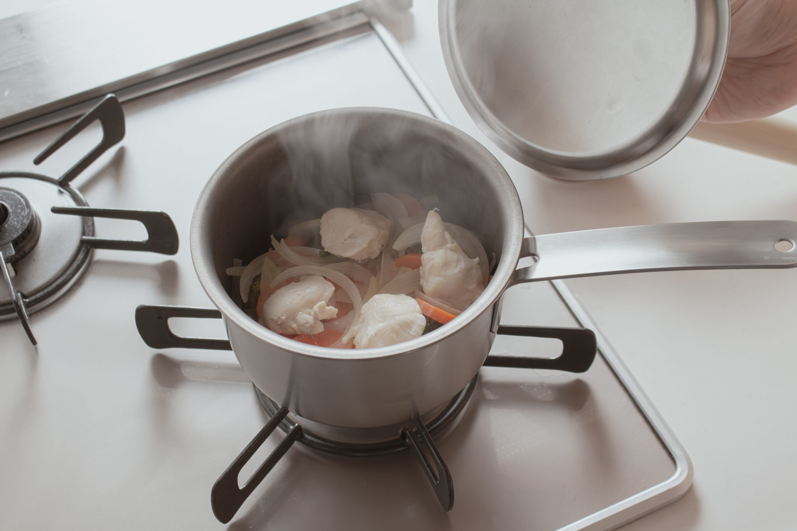 鍋にブロッコリー、にんじん、玉ねぎ、鶏ささみの順番に並べて入れる。水大さじ5を加え、蓋をして弱火で10〜15分加熱する。火を止め、蓋をしたまま5分余熱調理する。