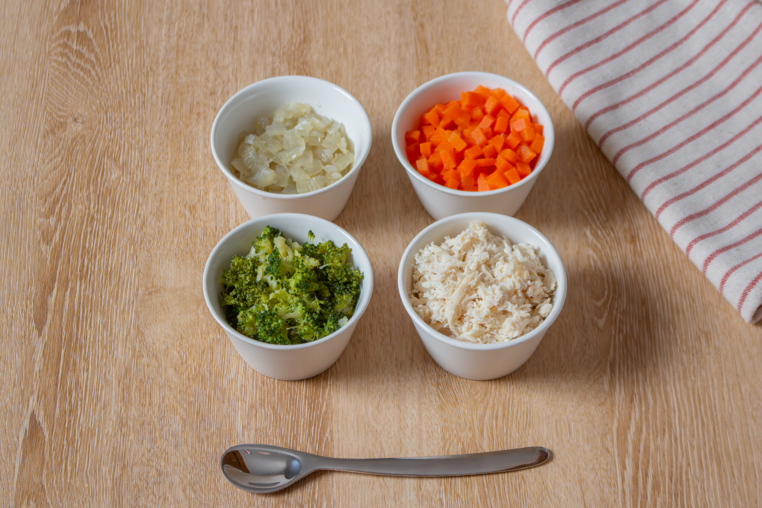 鶏ささみの筋を取り除き、4等分に切る。ブロッコリーは小房に分ける。にんじん、玉ねぎは皮をむき、5㎜幅程度の薄切りにする。
