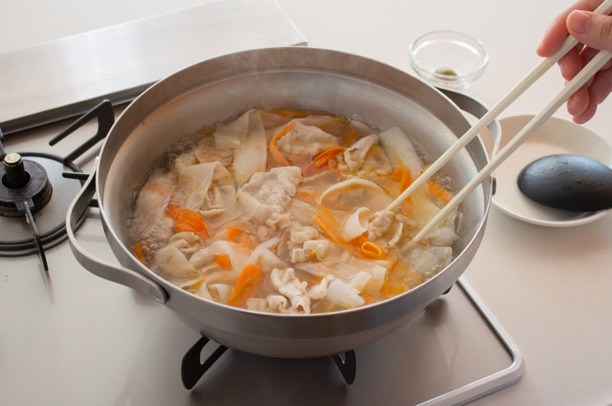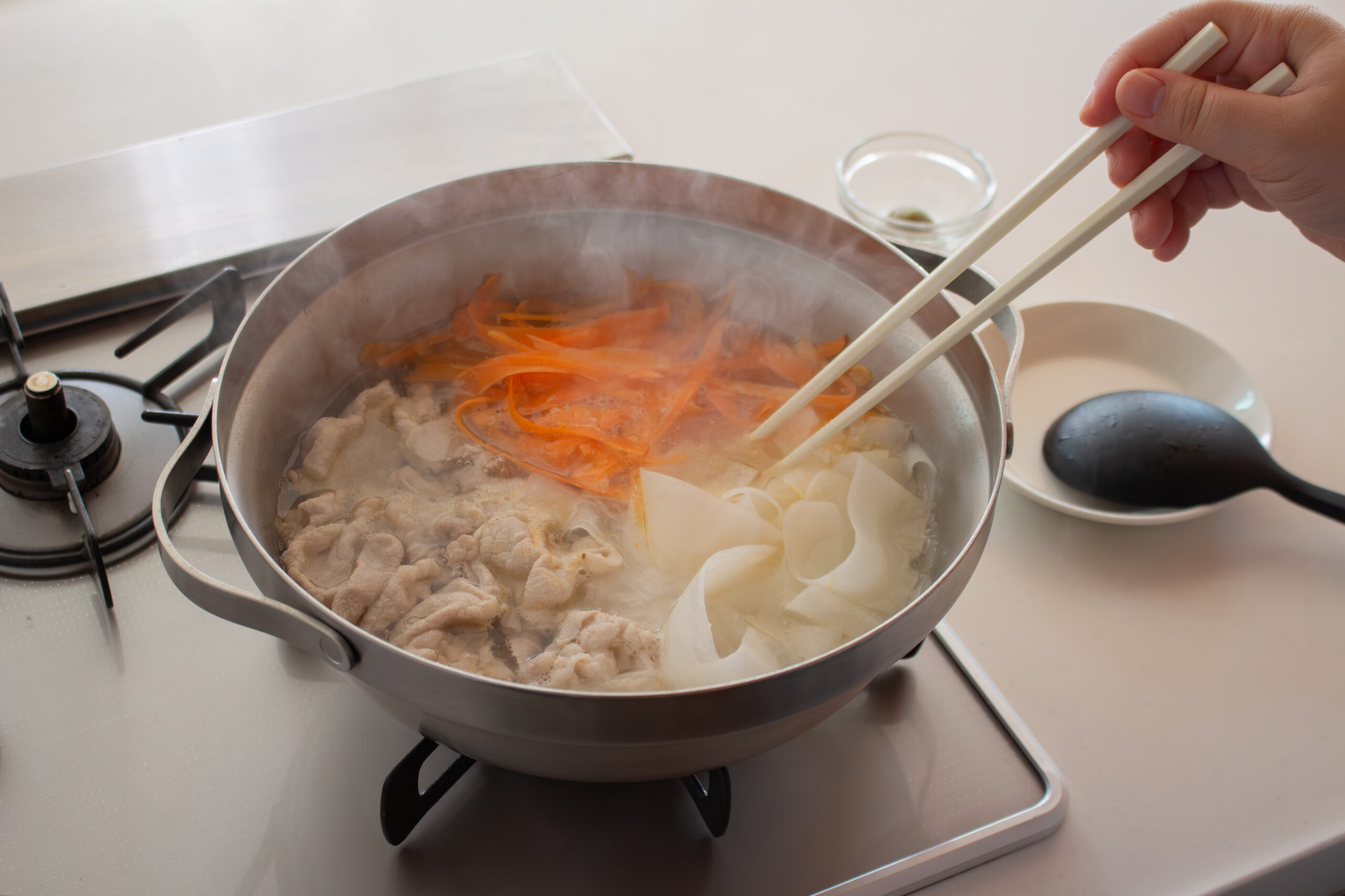 鍋にスープの材料を全て入れて火にかける。沸騰したら①と豚肉を入れて加熱し、あくを取ったら完成。お好みで柚子胡椒をつけてお召し上がりください。
