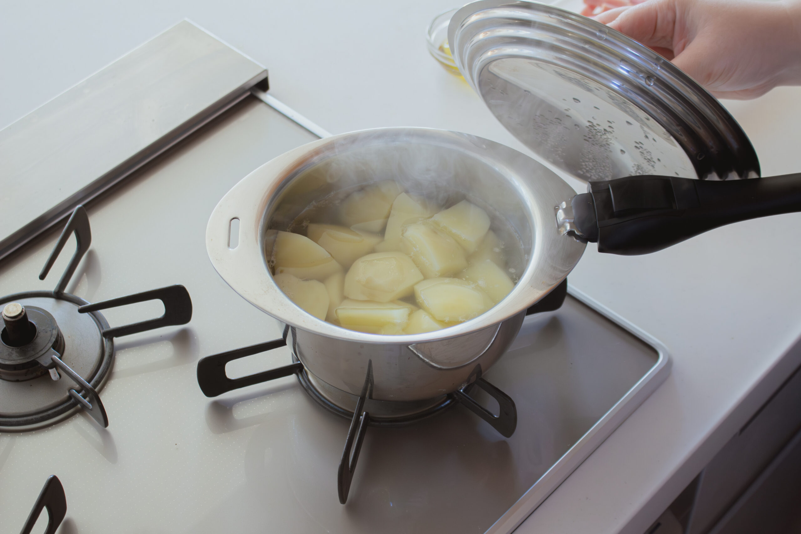 鍋にじゃがいもを入れ、じゃがいもの1/3が隠れるくらいの水(分量外)を加えて蓋をして5〜8分弱火で加熱し、余熱で5分蒸す。