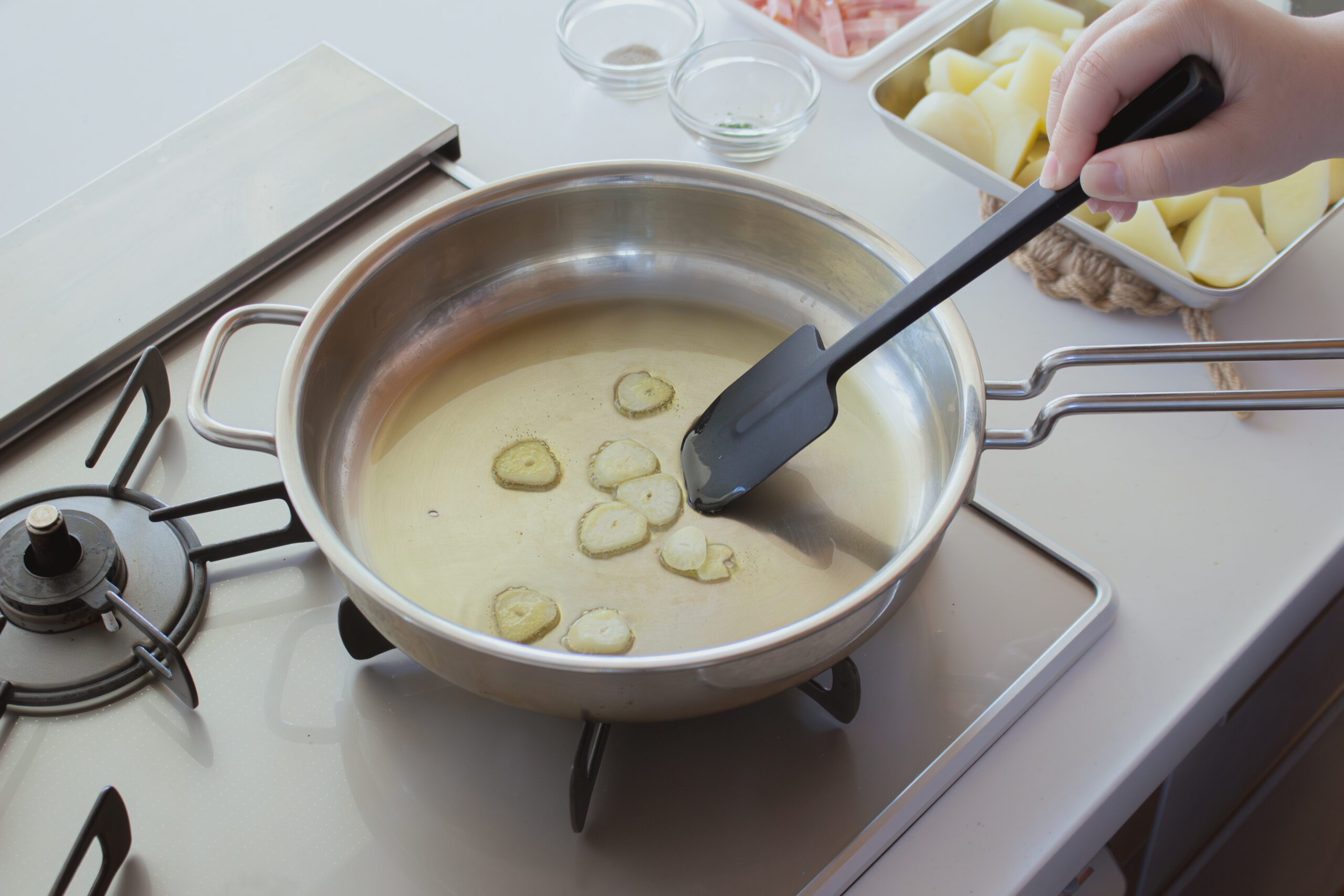 にんにくはスライスする。 -