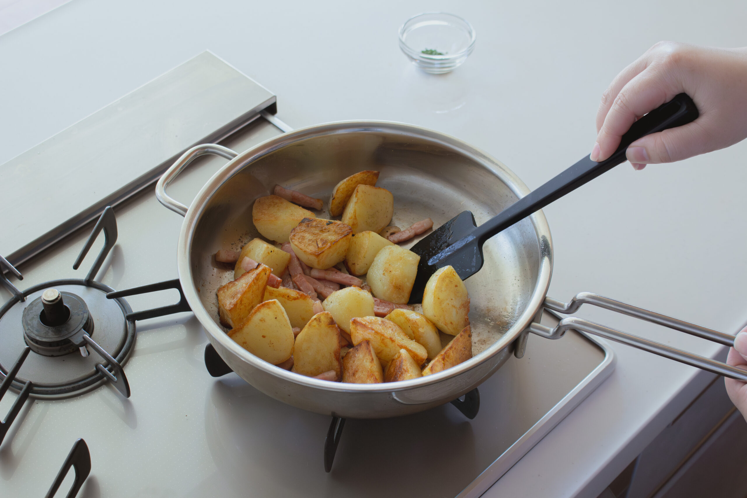 じゃがいもとベーコンを加えて炒め、塩こしょうで味付けし、パセリを散らしたら完成。