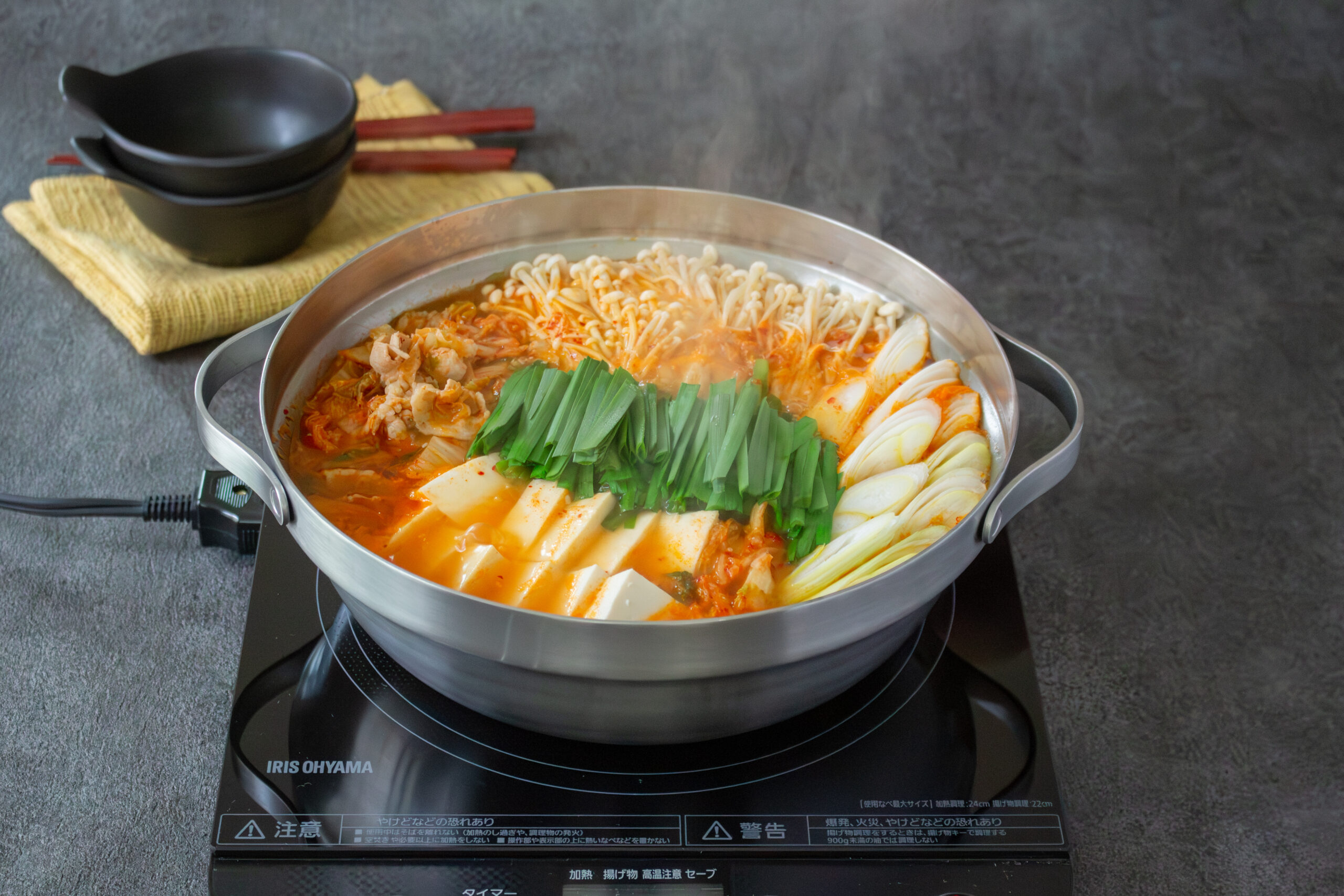 キムチはざく切りにする。豚バラは3cm幅に切る。木綿豆腐は一口大に切る。長ねぎは斜め切りにする。えのきたけは石づきを切り、ほぐす。ニラは4cm幅に切る。