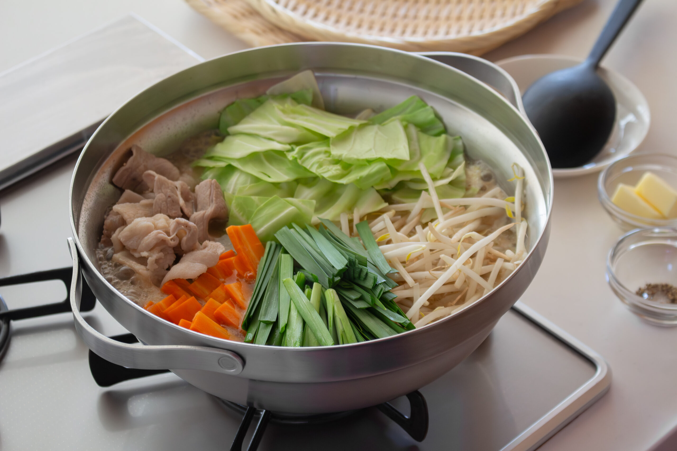 ●を鍋に入れ沸騰させ、味噌を溶かし入れる。豚バラを入れ、火が通ったら野菜を加え、蓋をして5〜10分煮る。