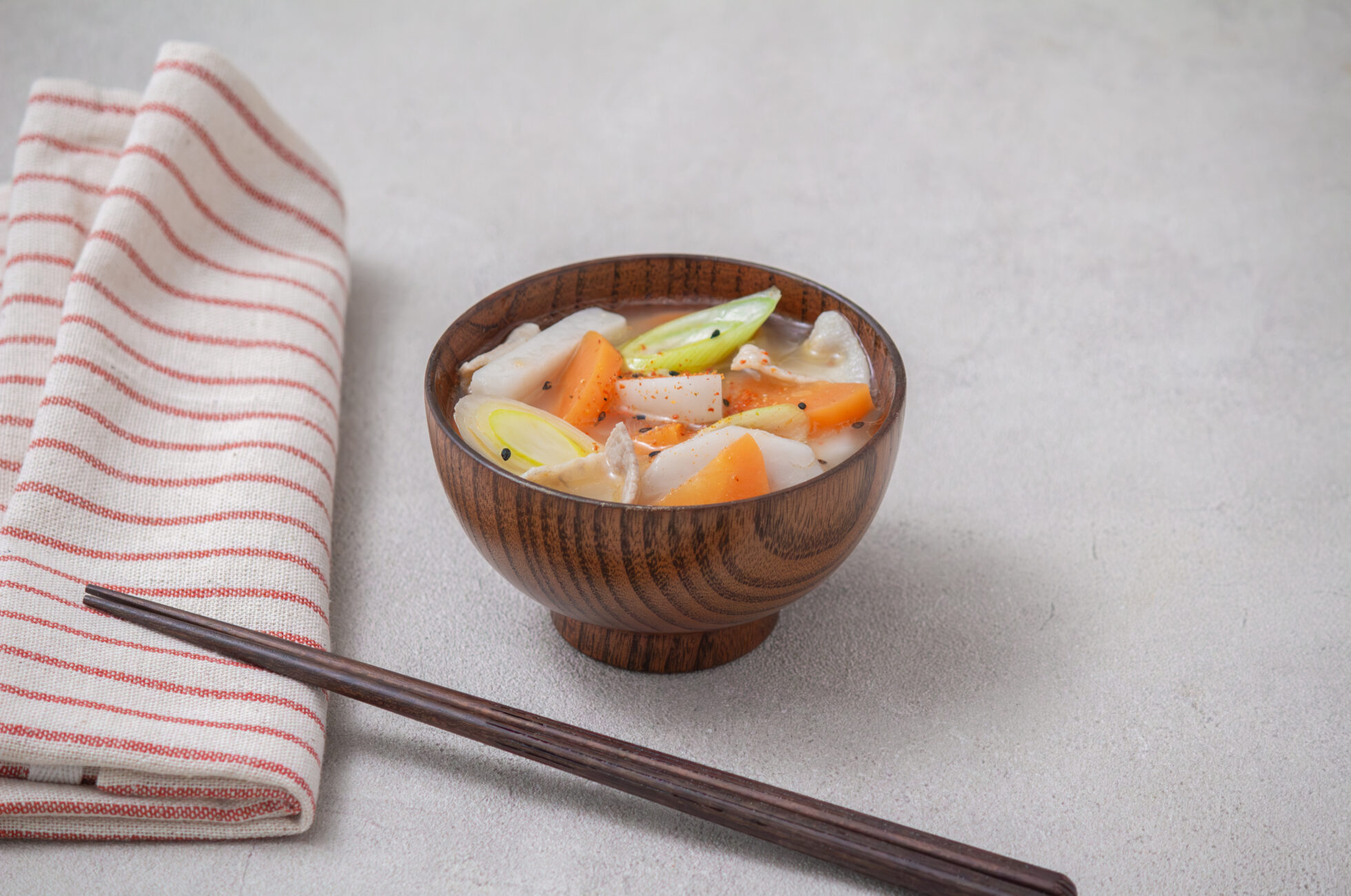 豚肉は3センチ幅に切る。里芋は1cm幅の半月切りにし、塩でもんで水洗いしてぬめりをとる。にんじんは5㎜幅の半月切りにする。長ネギは1cm幅の斜め切りにする。