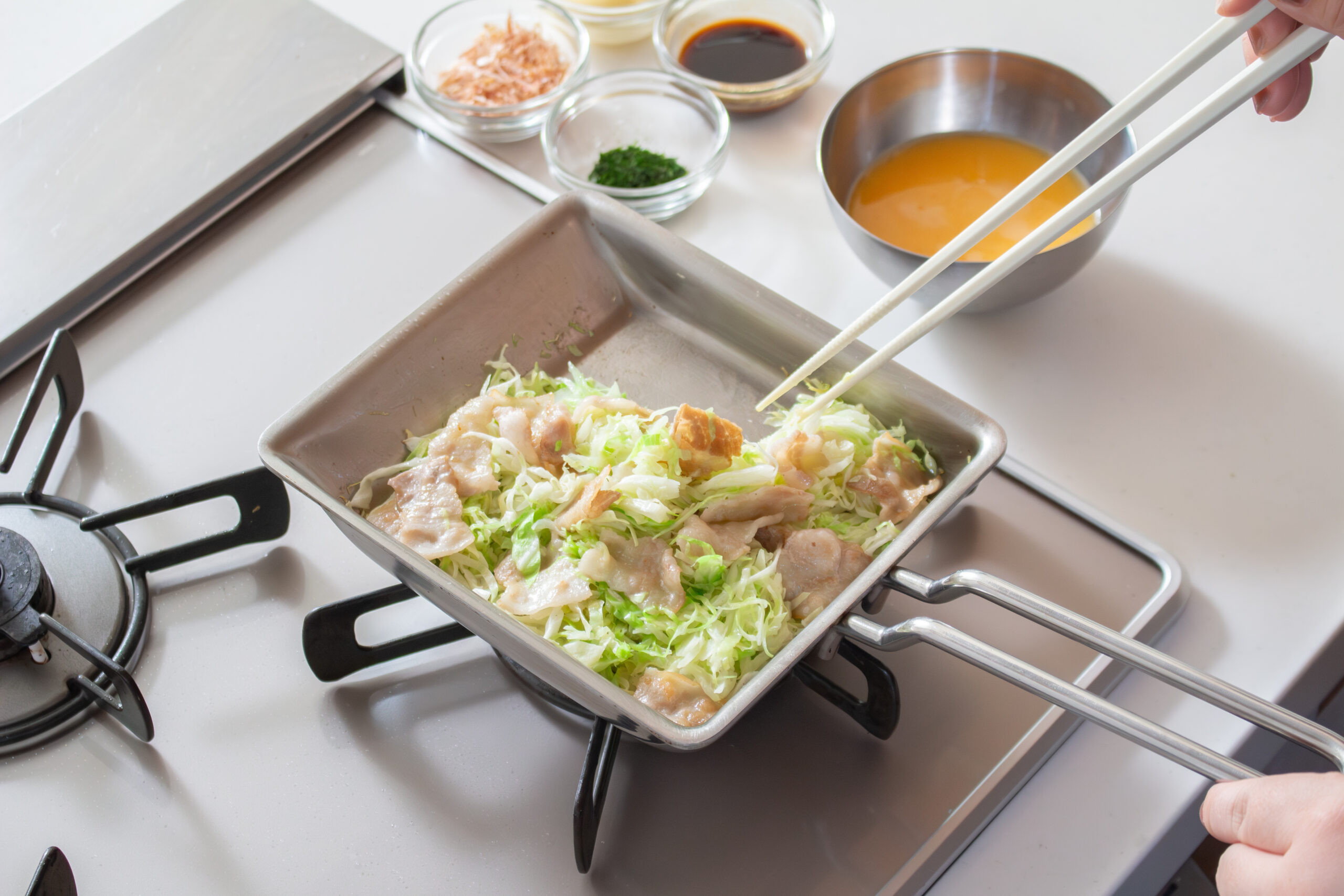 鍋にサラダ油を入れて中火で熱し、豚バラ肉とキャベツを炒める。キャベツがしんなりしたら塩こしょうで味をつけ、器に取り出す。