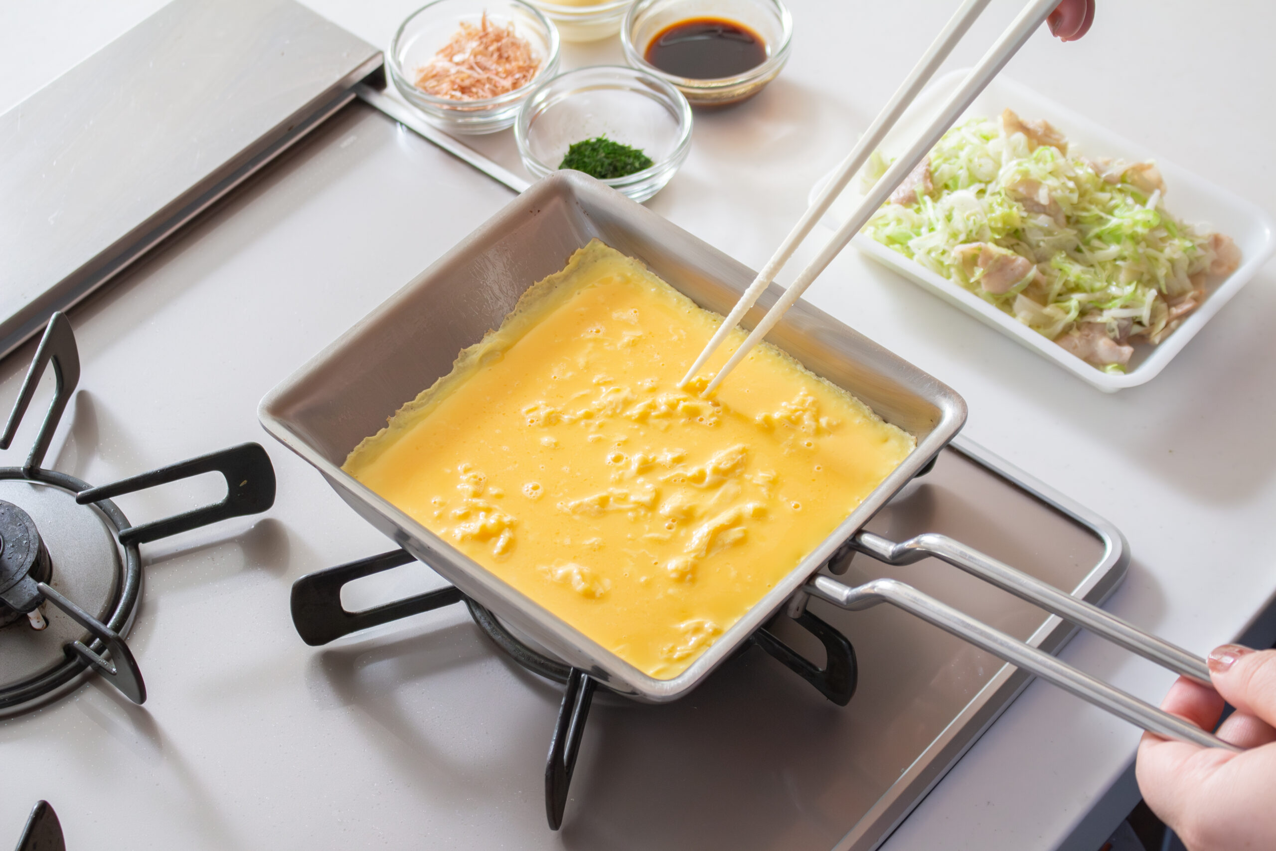 鍋にサラダ油を入れて中火で熱し、③を流し入れる。軽く混ぜ、半熟になったら②を中央に乗せて両端を折りたたむ。