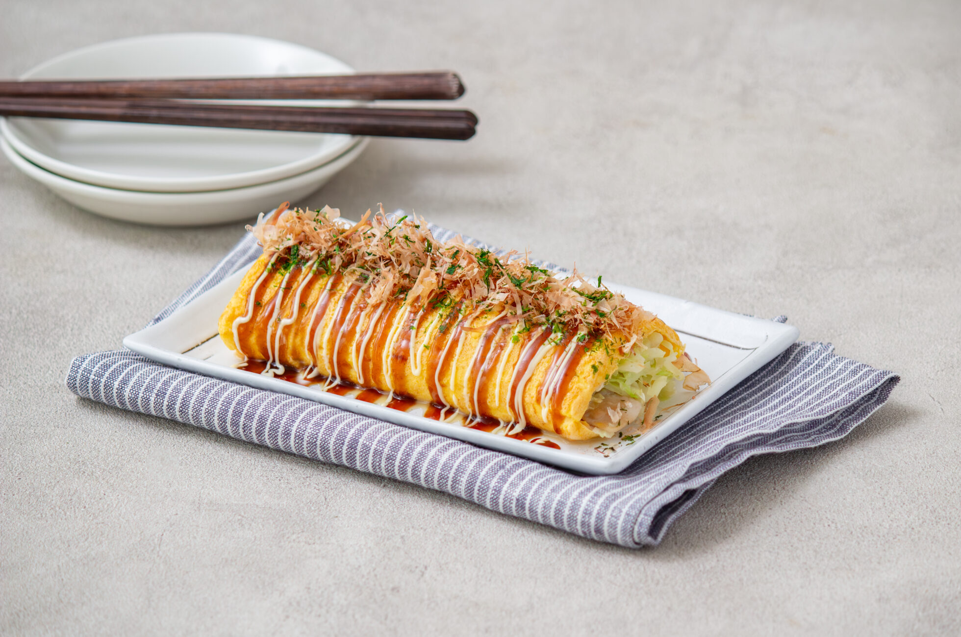 折りたたんだ部分が下になるように器に盛り付け、ソース、マヨネーズ、青のり、鰹節をトッピングしたら完成。